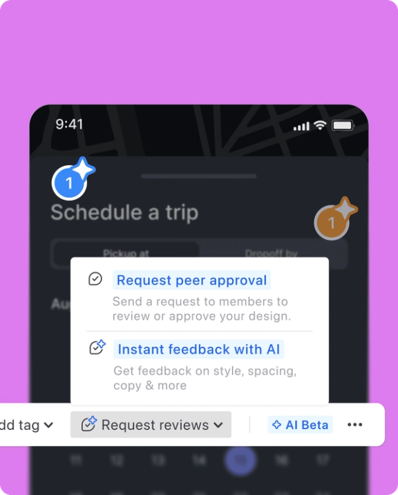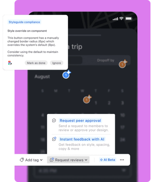 Scan designs with AI Design Review, catching off-system colors, spacing inconsistencies, typos, and accessibility issues before sharing with devs.