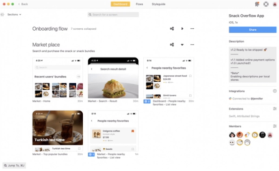 Marking sections in your Figma file as “ready for dev” can serve as a way to organize the canvas, but each file layout can vary, depending on the designer. Zeplin arranges screens in a grid structure where sections have a clear hierarchy, with lots more features for design file organization – from tag filters, screen variant groups to a powerful global search.